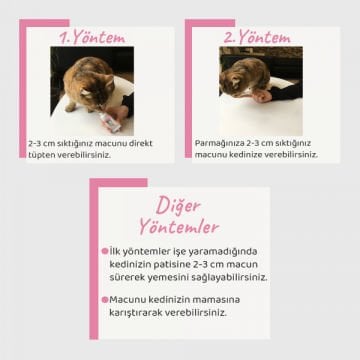 Kediler macun vitaminleri genellikle tüpün ucundan kolayca tüketirler. Yeme şekline göre patisine sürerek ya da mamasına karıştırarak da verebilirsiniz.